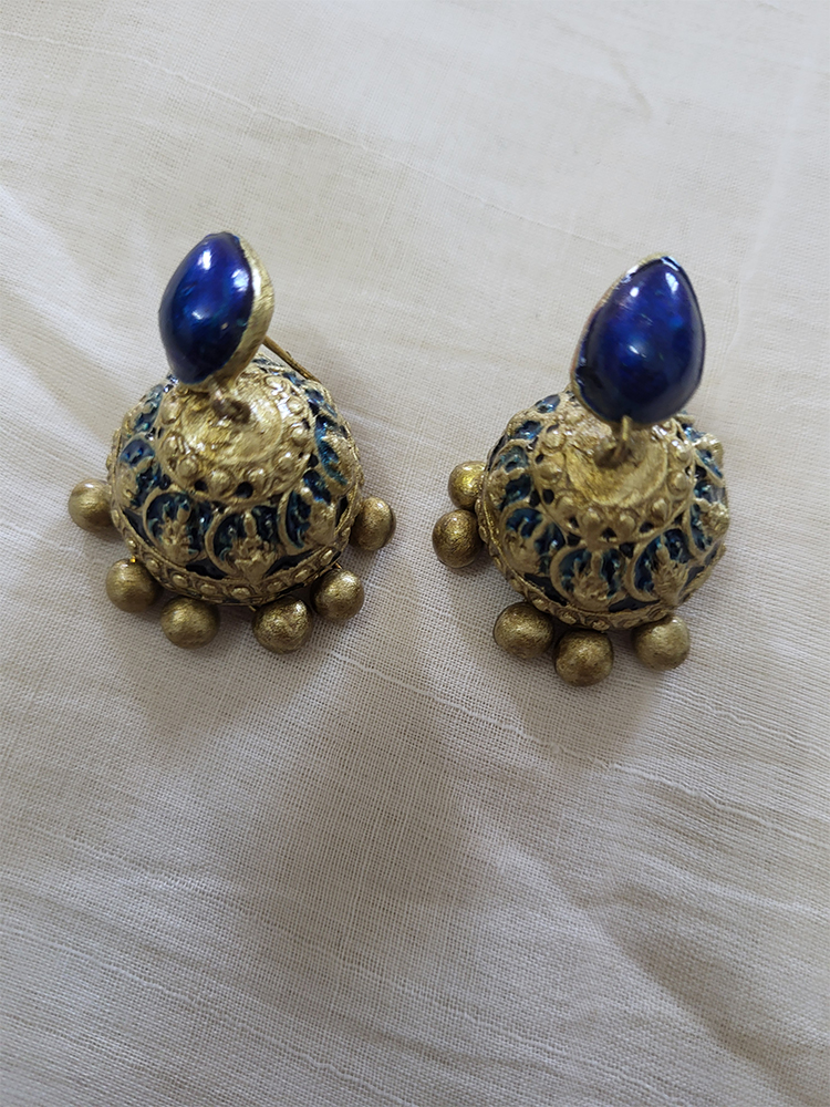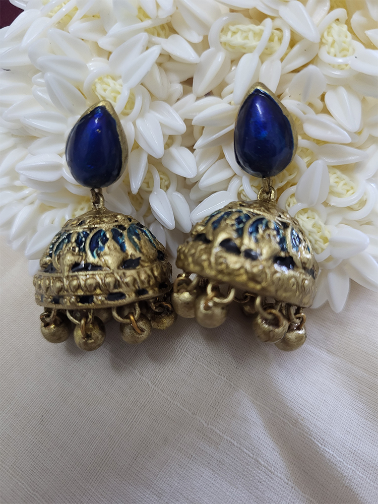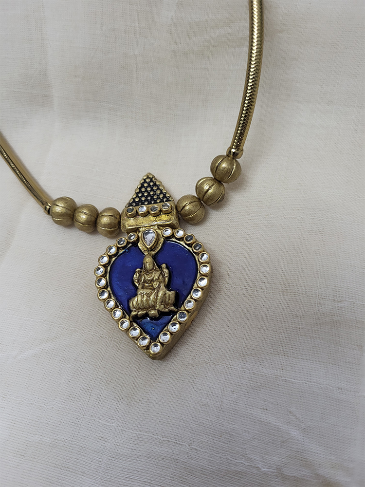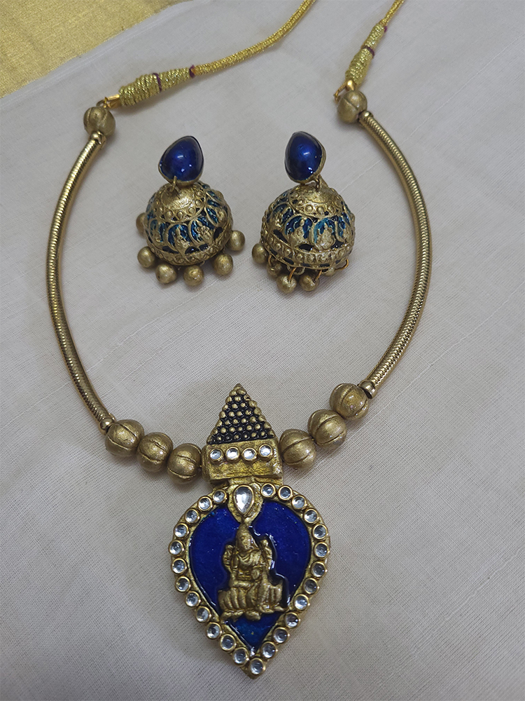 A traditional terracotta necklace set featuring a royal blue pendant with an intricately carved divine motif. The necklace is paired with beautifully crafted blue-golden jhumkas that enhance its ethnic charm. Perfect for festive occasions, temple visits, cultural events, or elevating a traditional outfit with a statement piece.