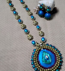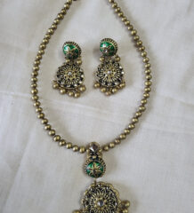 This exquisite emerald green stone necklace set is crafted to deliver a regal and luxurious look. Featuring shimmering green stones arranged in an intricate V-shaped design, the necklace is paired with beautifully matching drop earrings. The rich colour, impeccable shine, and sparkling accents make this set a perfect choice for special occasions.