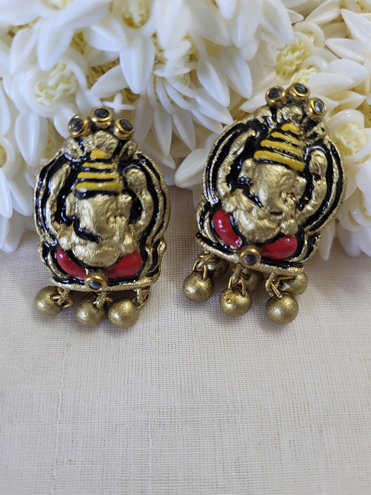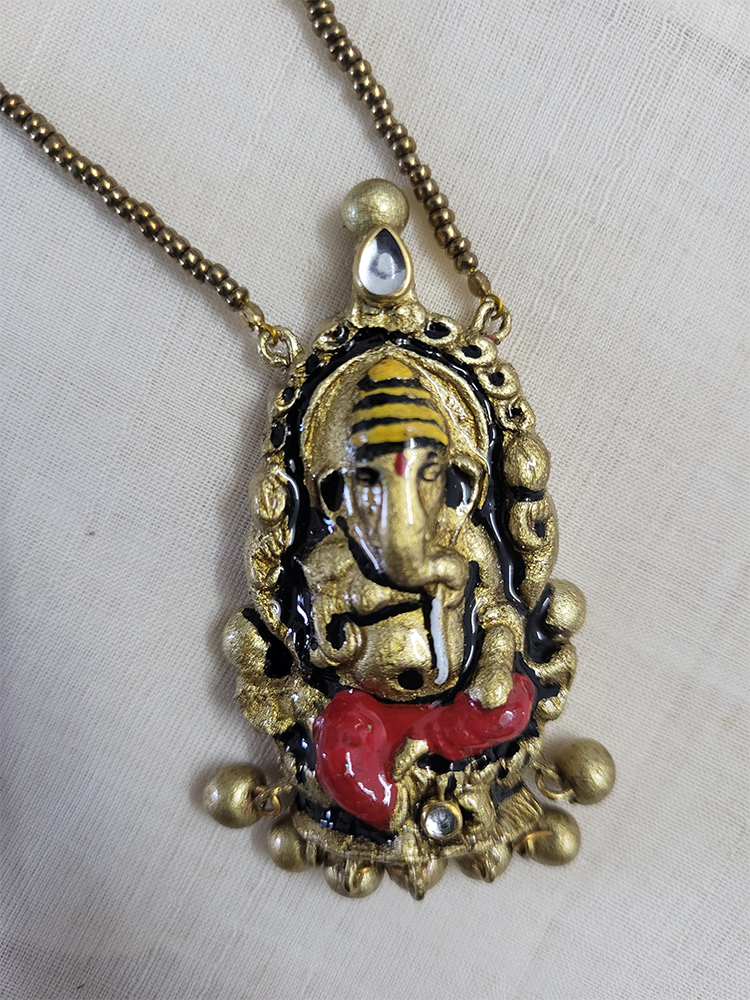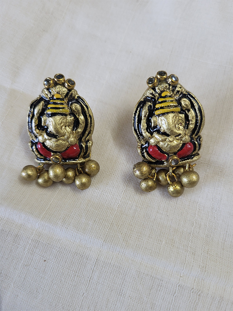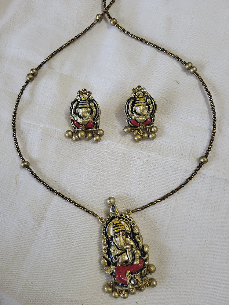 A beautifully crafted terracotta jewellery set featuring an intricately designed Ganesha pendant paired with matching earrings. The antique gold finish and delicate detailing bring a traditional and divine touch to your festive and ethnic look. Lightweight, artistic, and perfect for temple visits, cultural events, and festive celebrations.