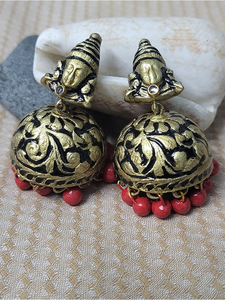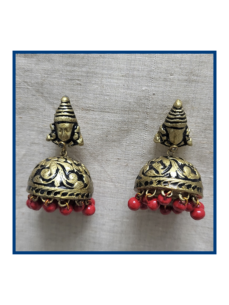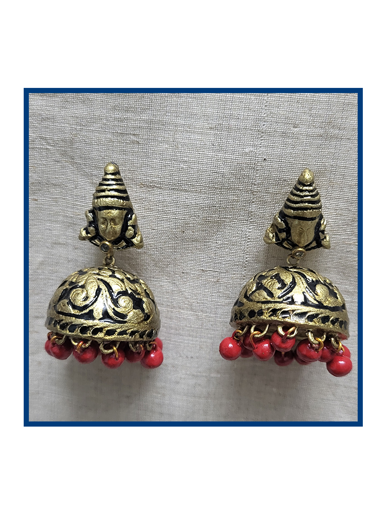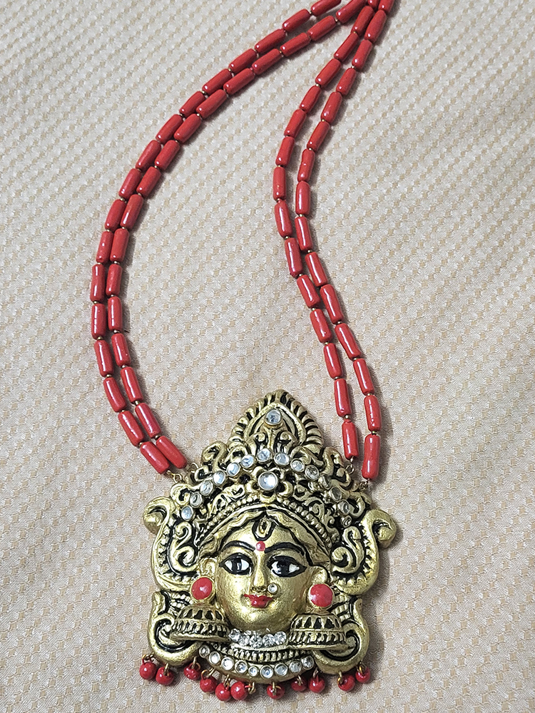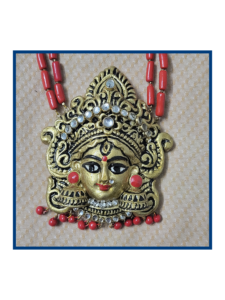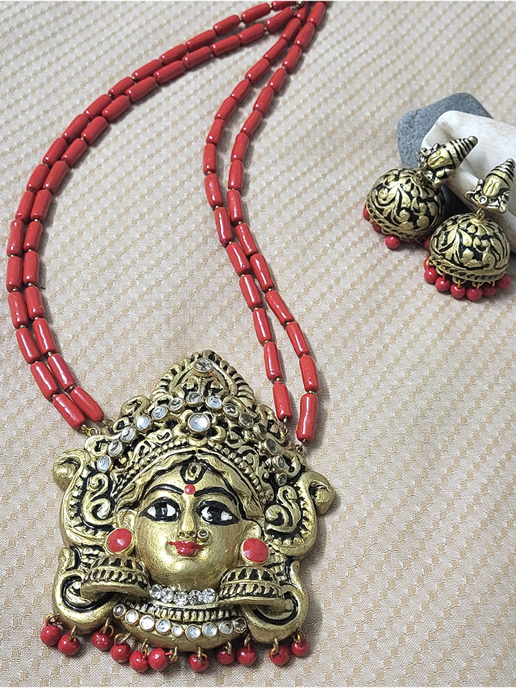 This handcrafted terracotta jewellery set features an intricately sculpted Goddess pendant paired with beautifully detailed matching earrings. The antique gold finish combined with vibrant red accents brings a divine and traditional charm. Perfect for festive occasions, temple visits, classical dance, and ethnic outfits. Lightweight, artistic, and culturally rich—this set is a true statement piece.