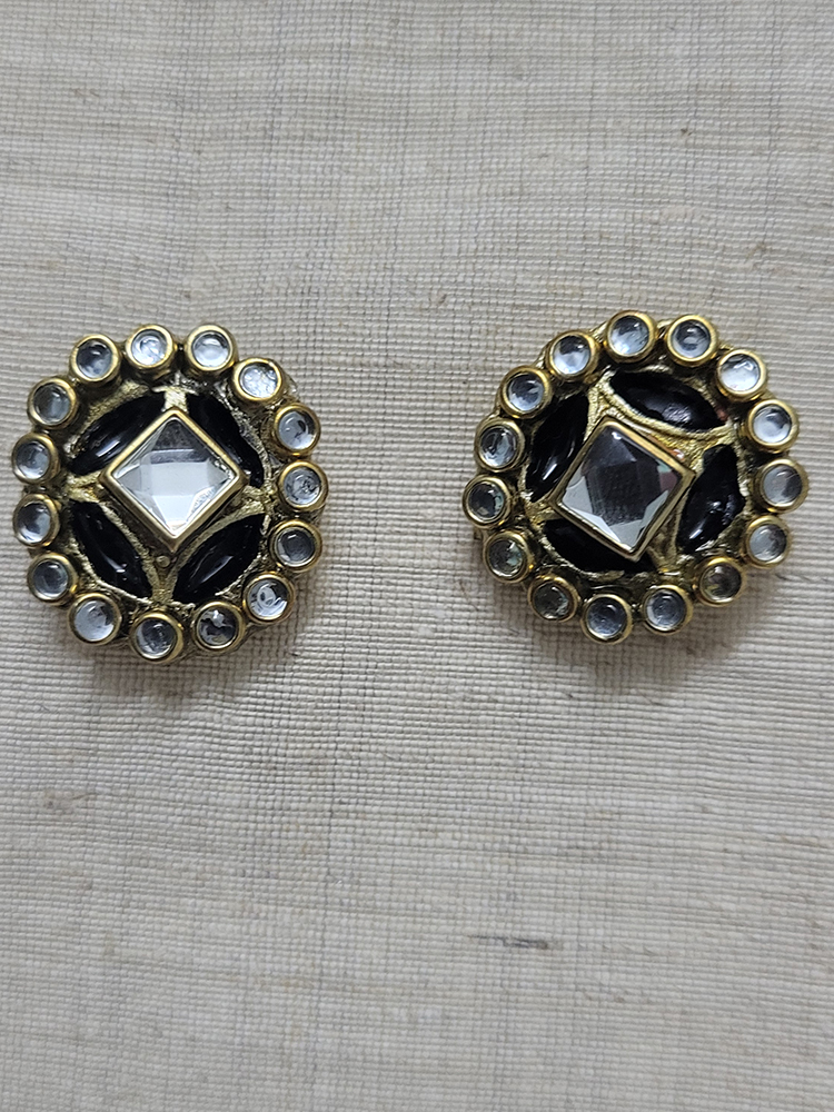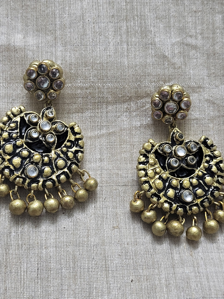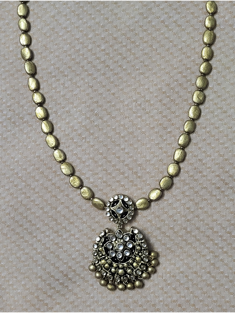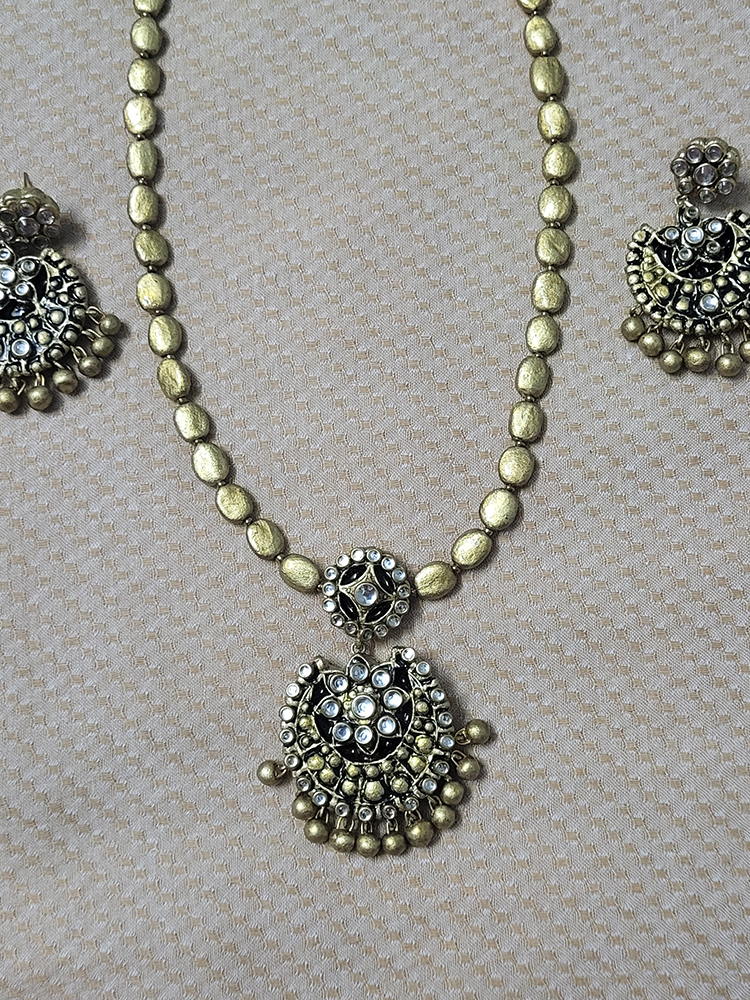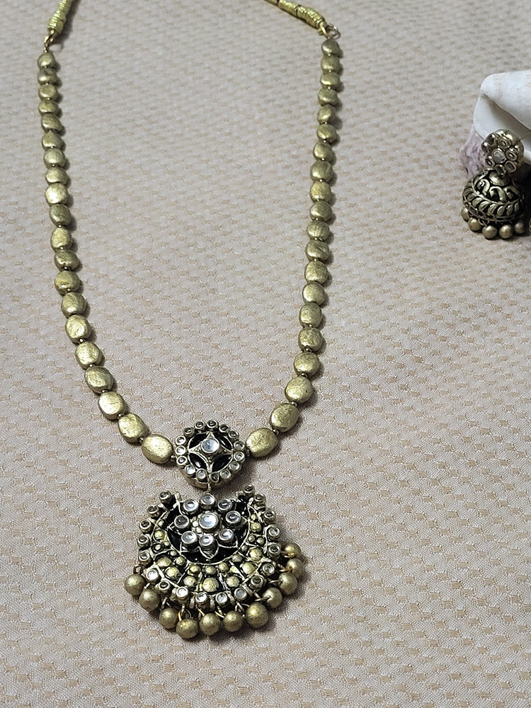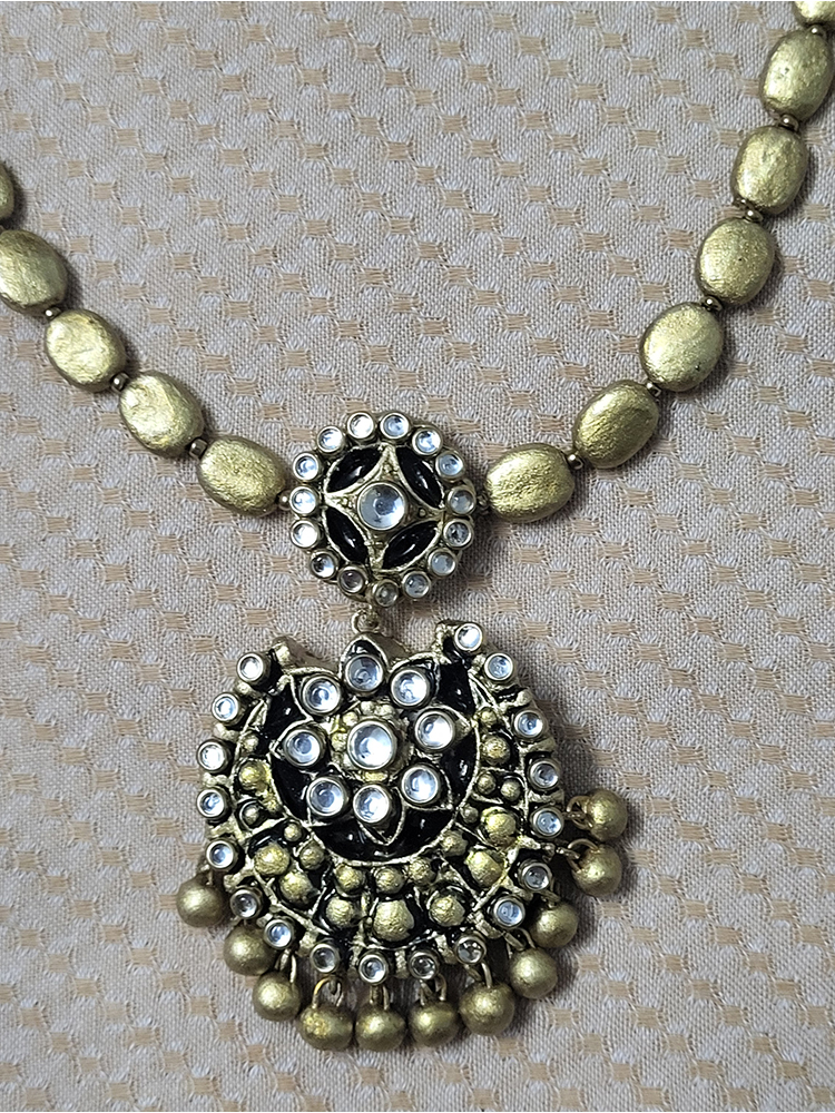 A beautifully crafted terracotta necklace set featuring an antique gold finish with intricate hand-detailed motifs. The central pendant is embellished with mirror-style elements and bead clusters, paired with matching traditional jhumka-style earrings. Perfect for festive occasions, cultural functions, or adding an elegant ethnic touch to any outfit.