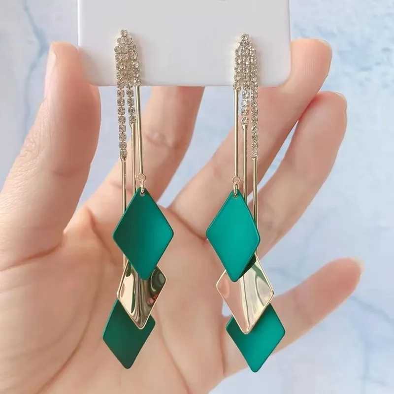 These green and gold geometric layered drop earrings are a vibrant and stylish choice for modern jewellery lovers. Featuring matte green diamond shapes paired with glossy gold accents and sparkling stone tassels at the top, this pair brings movement, colour, and contemporary elegance. Lightweight and eye-catching, they elevate both western and indo-western outfits effortlessly.