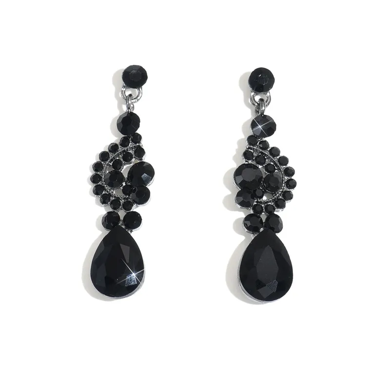 Elegant and dramatic, these black crystal drop earrings feature a beautifully intricate swirl design adorned with glossy beads and a bold teardrop stone.